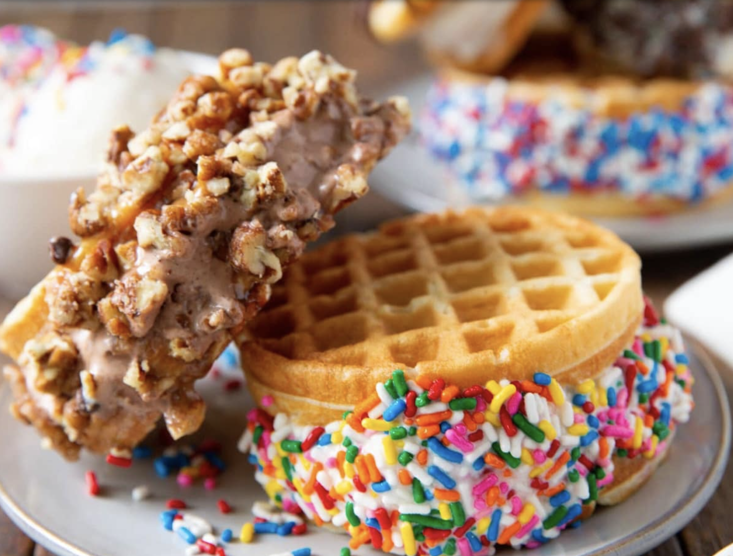 Make a batch of waffles and let them cool or warm up toaster waffles. Sandwich a scoop of ice cream between each waffle pair and then place back in the freezer to cool. Once they are firm, melt chocolate and dip each sandwich in the bowl. Roll the melted chocolate side in nuts, sprinkles etc. and pop back into the freezer until you are ready to serve.