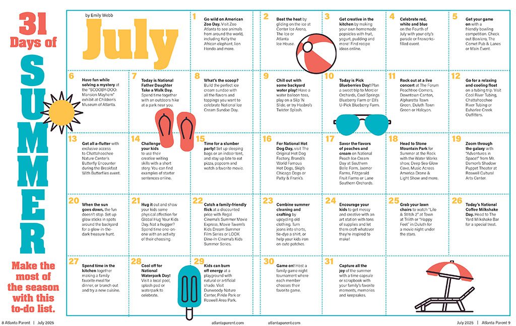 July 29: Kids can burn off energy at a playground with natural or artificial shade. Visit Dunwoody Nature Center, Pirkle Park or Roswell Area Park.