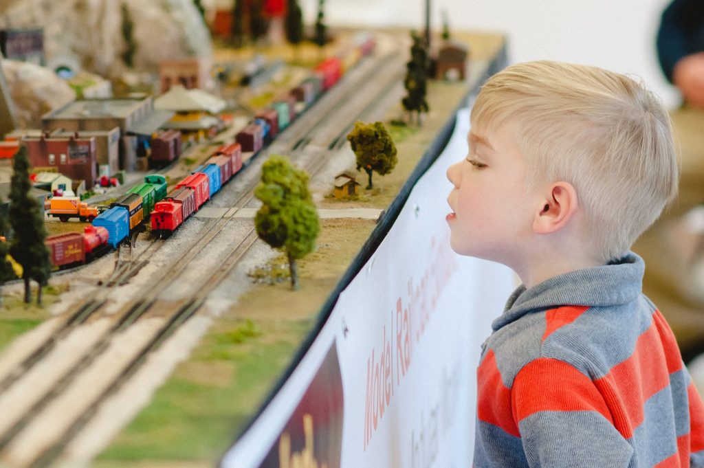 Model train expo with railroad artifacts and moving trains at Southern Museum.