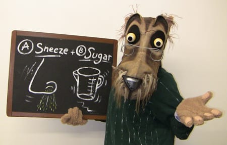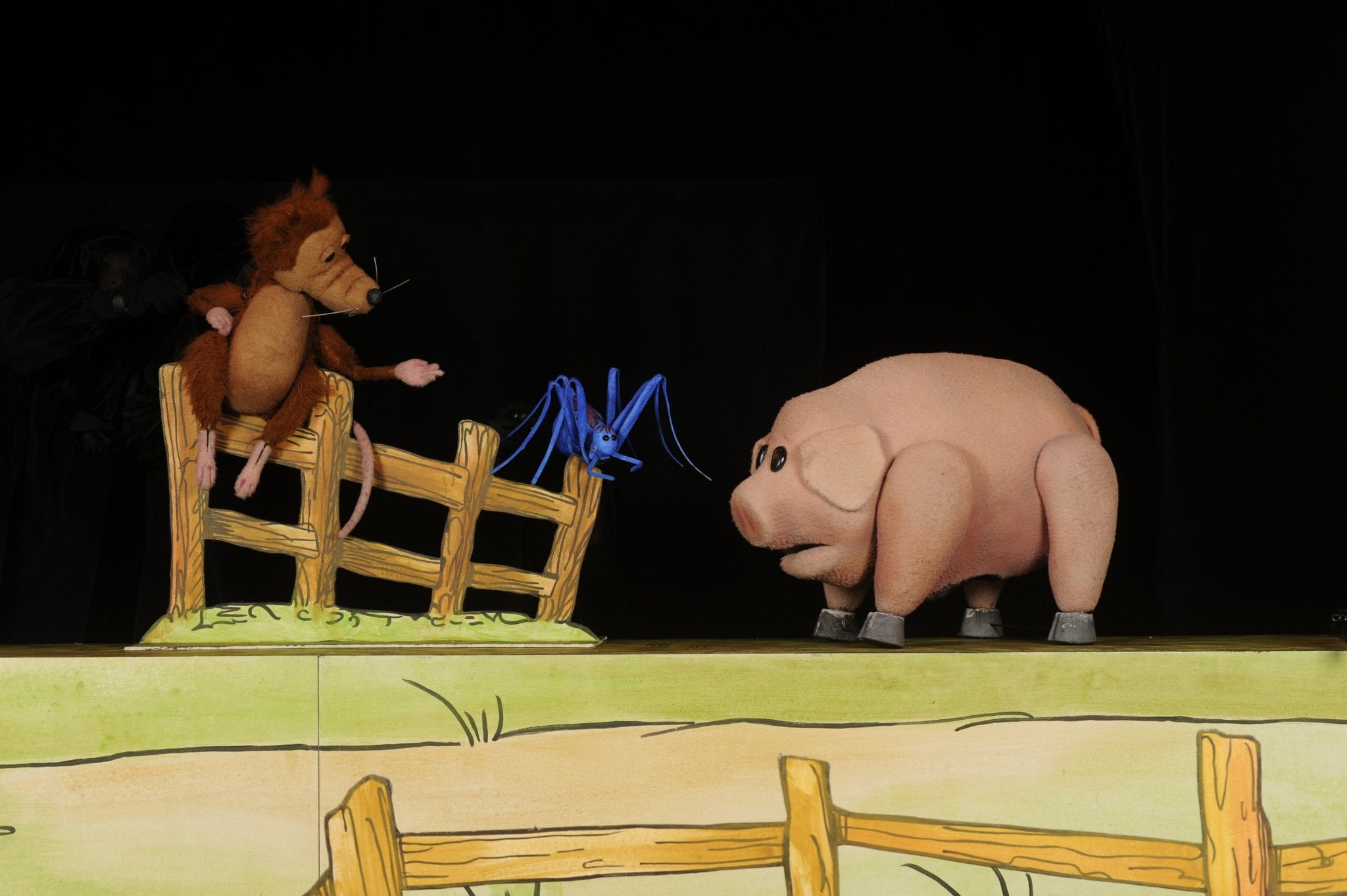 Mr. A. Wolf tries to explain what really happened to the houses made of straw, sticks and bricks, along with the three little pigs at the Center for Puppetry Arts